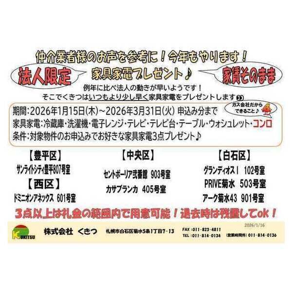 法人限定!家賃そのまま家具家電プレゼント♪